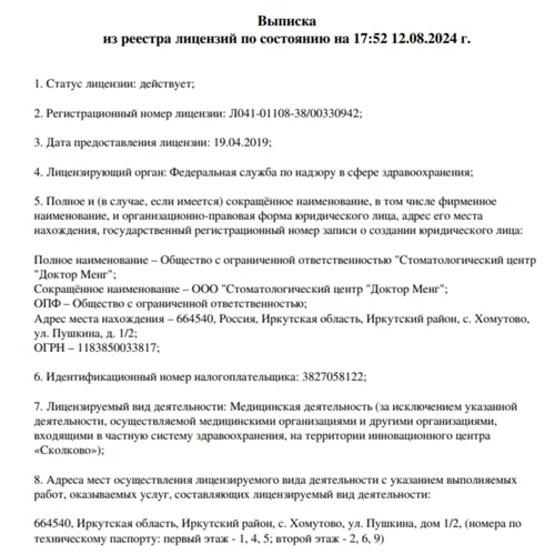 ООО "Стоматологиеский центр "Доктор Менг" ИНН: 3827058122. ОГРН: 1183850033817.